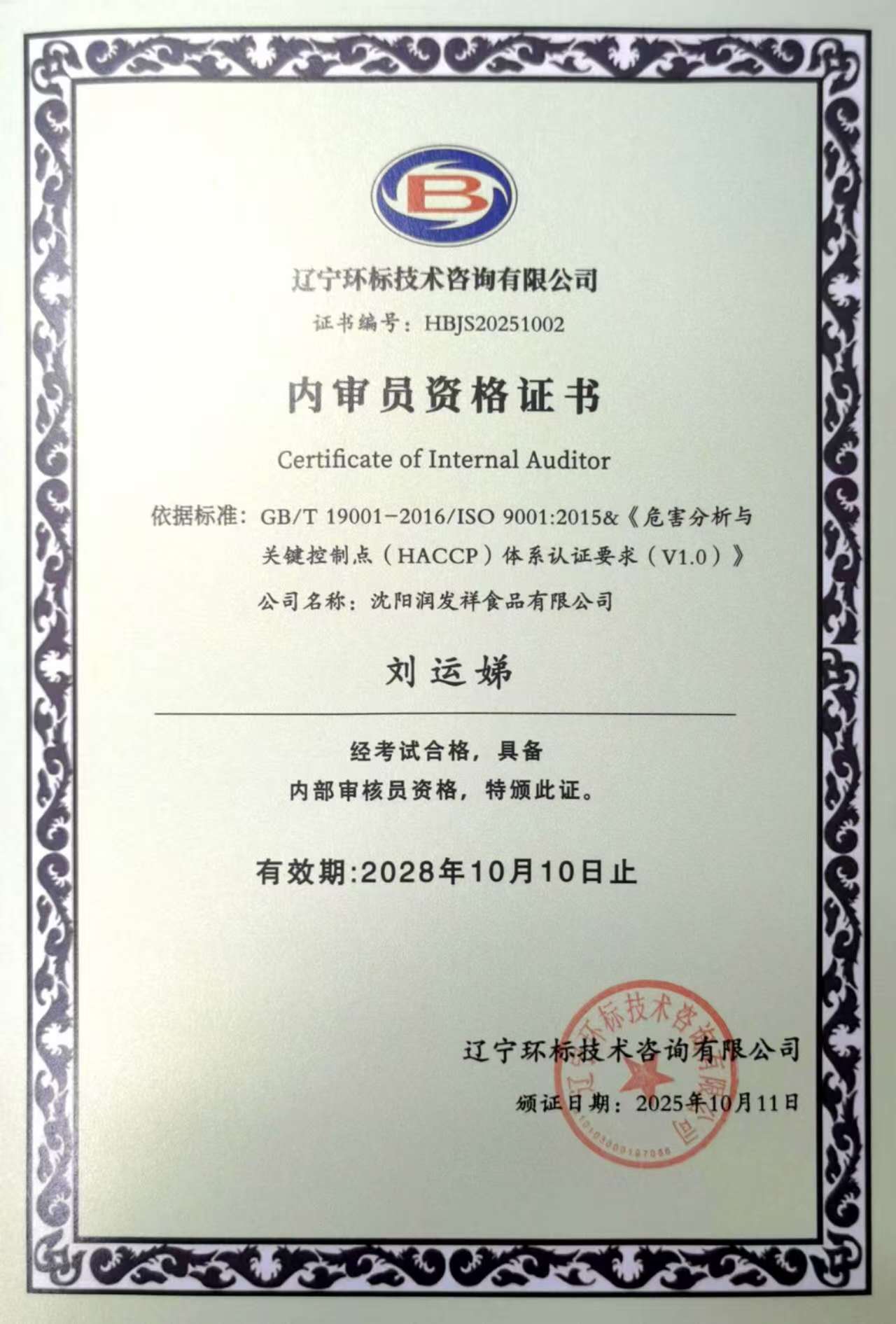 2025.10.11,环标技术公司为沈阳润发祥食品有限公司员工刘丹、刘运娣二位同志颁发了内审员资格证书。现予以公告。